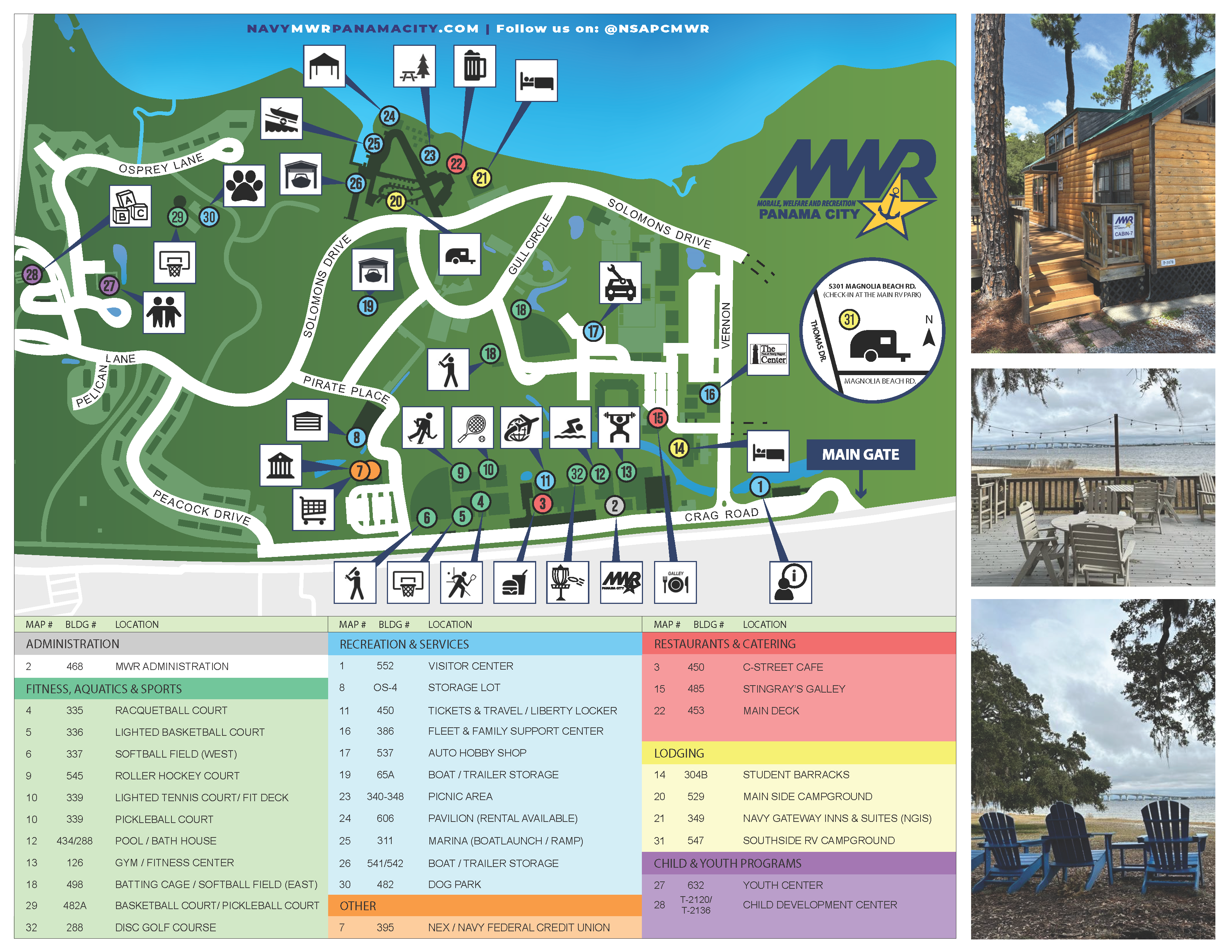 NSA Panama City MWR Base Map with numbered location markers and facility icons. Includes a map legend with location numbers, building numbers, and facility titles.